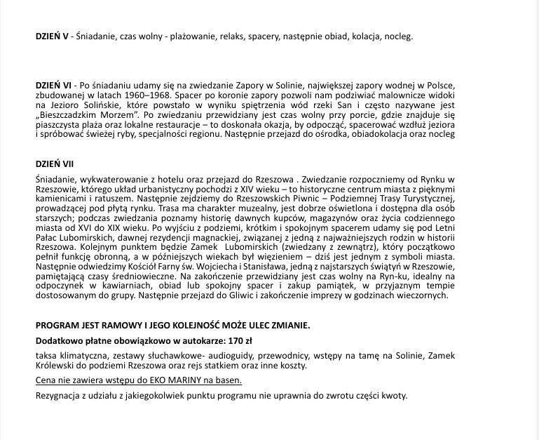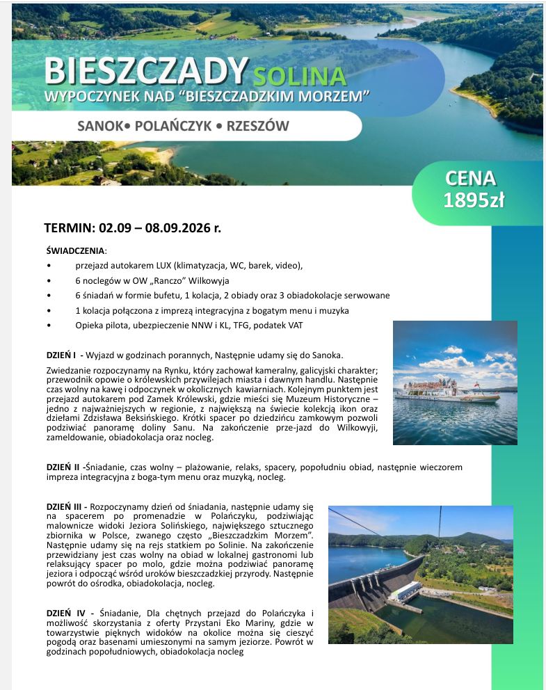Z przyczyn technicznych organizatora zmienił się termin wycieczki do Krynicy Górskiej. Wyjazd 01.09.2025 (wyjazd w godzinach rannych) do 07.09.2025.