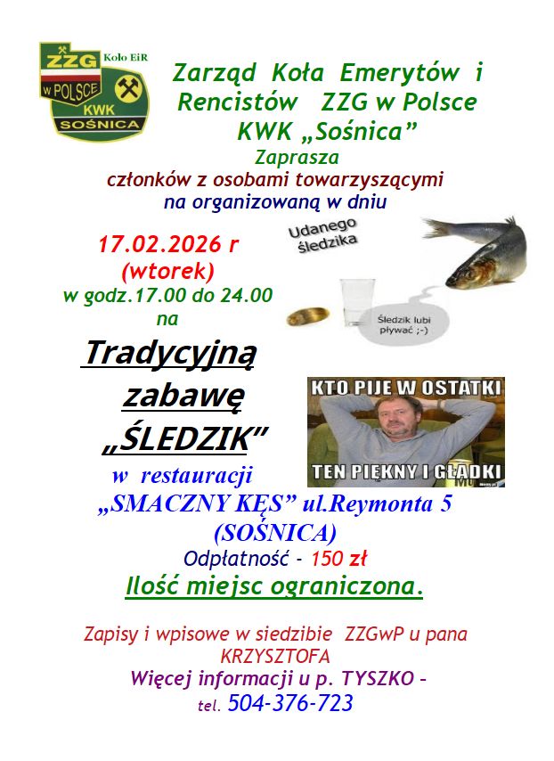 Będziemy tez przyjmować całość kwoty na zabawę „ŚLEDZIK” (17.02.2026) w kwocie 150 zł od osoby.