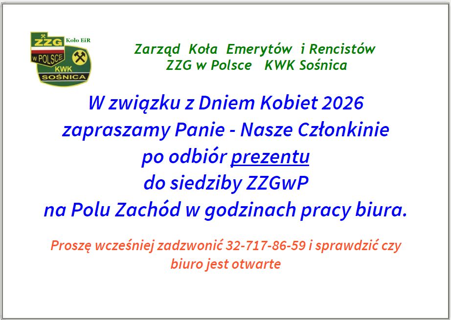 Prośba. Osoby z Koła Emerytów i Rencistów chcące wpłacić składkę roczną za przynależność do koła, albo zaliczkę na wycieczkę (w innym terminie niż ogłoszony wcześniej) proszone są o wcześniejsze zadzwonienie do biura ( 32-717-86-59 ), aby sprawdzić czy ktoś będzie dostępny w biurze.